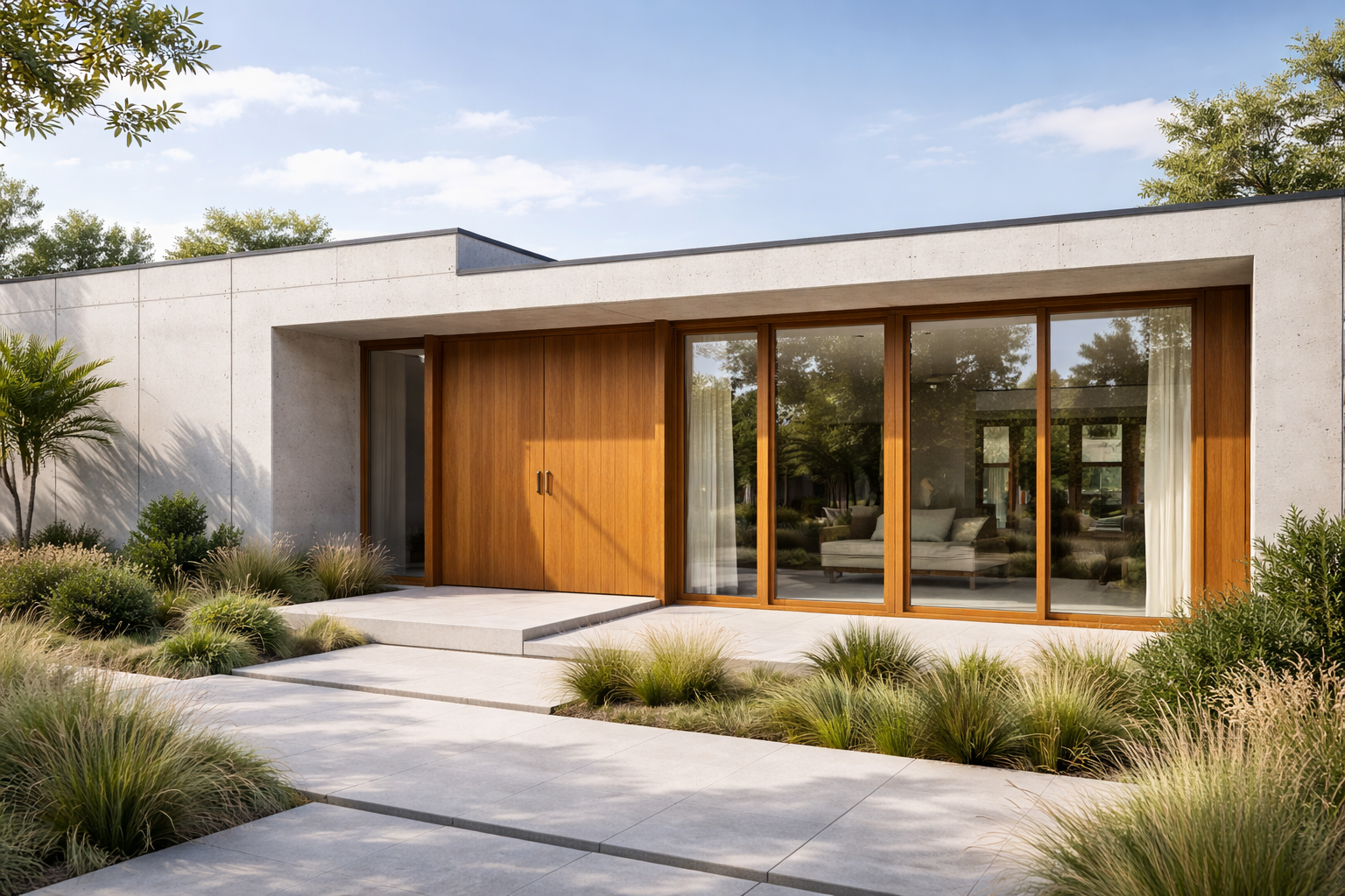 W minimalistycznym domu drewno nie krzyczy. Jest obecne, ale nienachalne. Drzwi i okna z drewna budują ciszę architektoniczną, która pozwala skupić się na formie i przestrzeni.