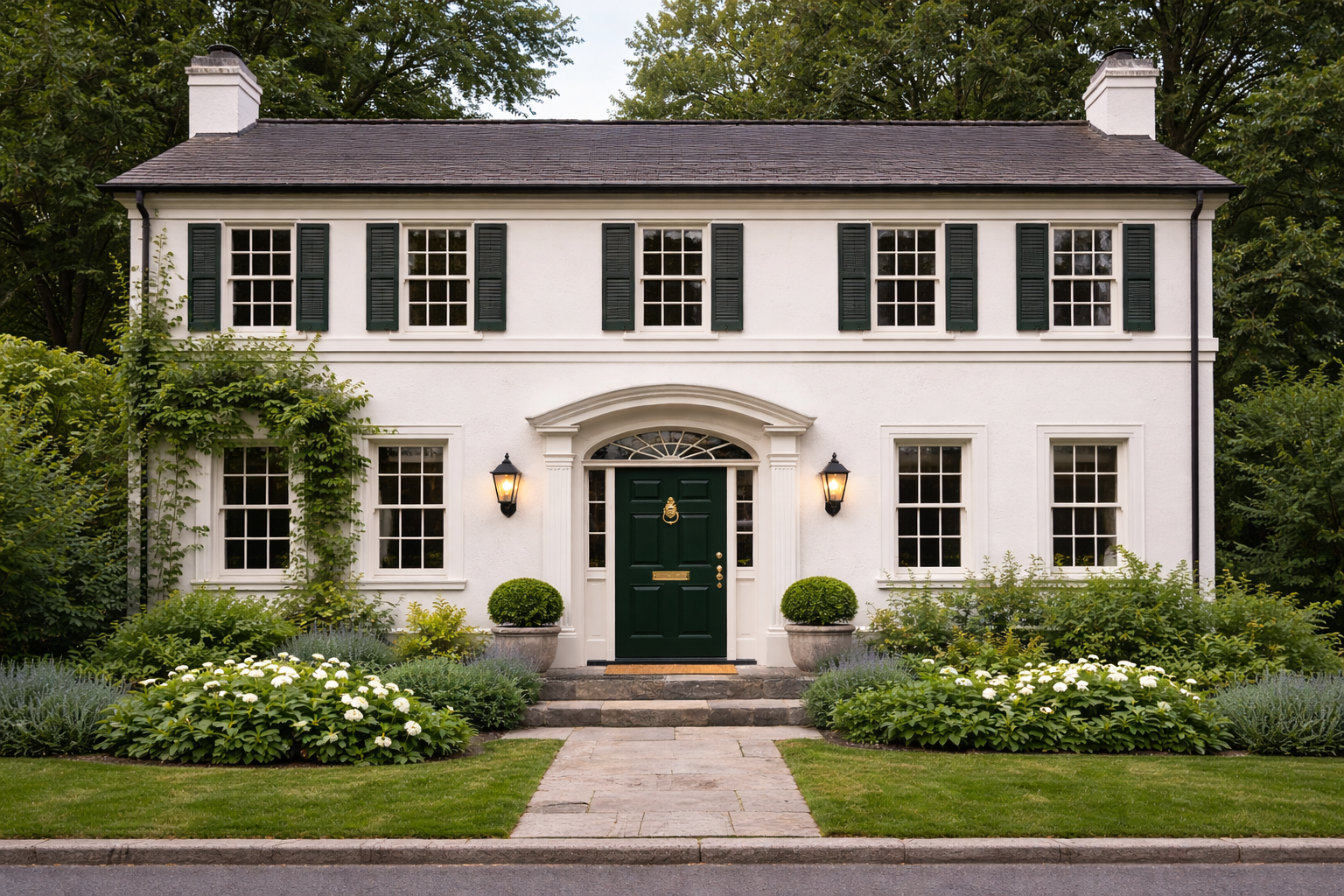 Drzwi angielskie umożliwiają zastosowanie szerokiego spektrum kolorów. W tradycji brytyjskiej dominują barwy nasycone, głębokie – zielenie, burgundy, granaty. Na tle jasnych elewacji kolory te stają się dominantami kompozycji i tworzą kontrast, który podkreśla wejście.